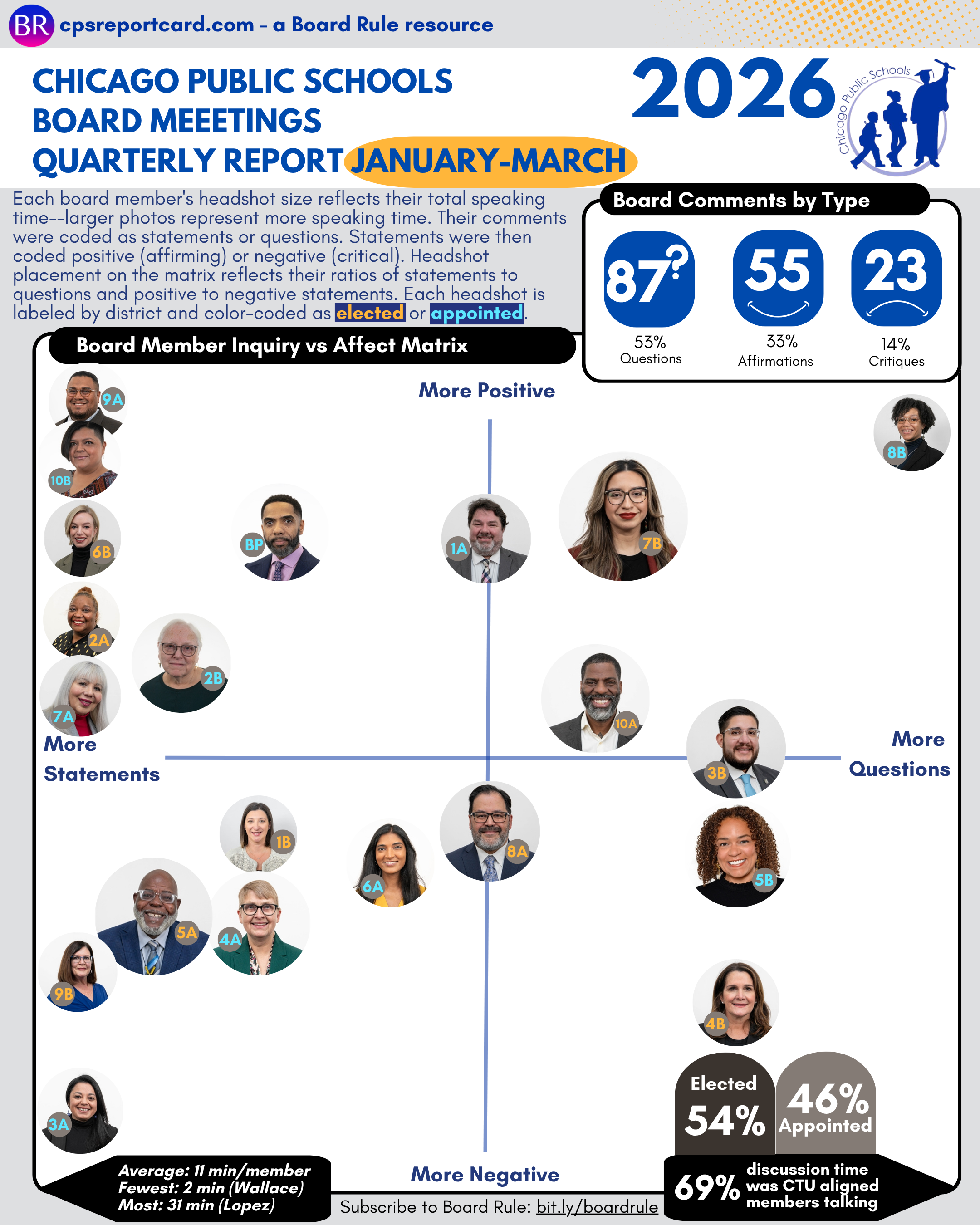 Methodology: Since the partially elected school board took office in January 2025, education researcher and former school board candidate Adam Parrott-Sheffer has been tracking the Chicago Board of Education's public meetings and policy decisions through four quarterly report cards and an annual review. He categorizes board comments and public participation into three broad categories: