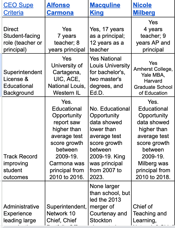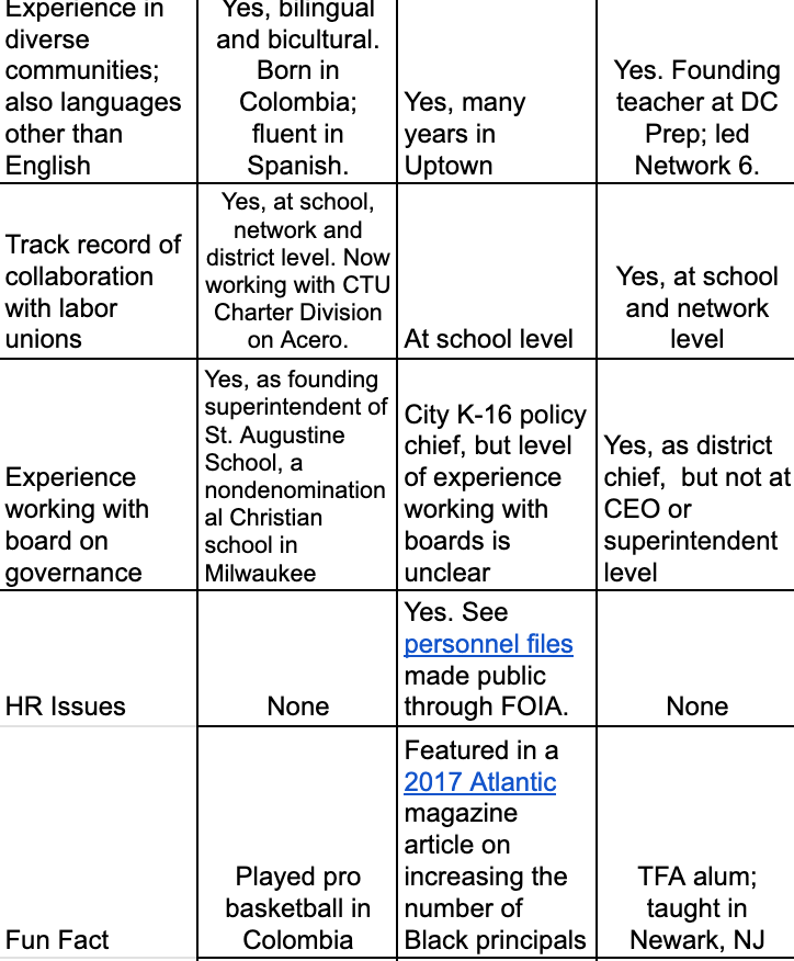 King: the City Hall favorite, but I hear that in interviews, she didn't look enthusiastic about the job. Also, the personnel file revelations about her slow responses to suspected child abuse and unsafe student-to-student bathroom activity have observers concerned. (If you can crack the Tribune paywall, they summarize the issues.) On the flip side, she was a 2017 Cahn Fellow, which selects high-potential principals for advanced training in leadership.