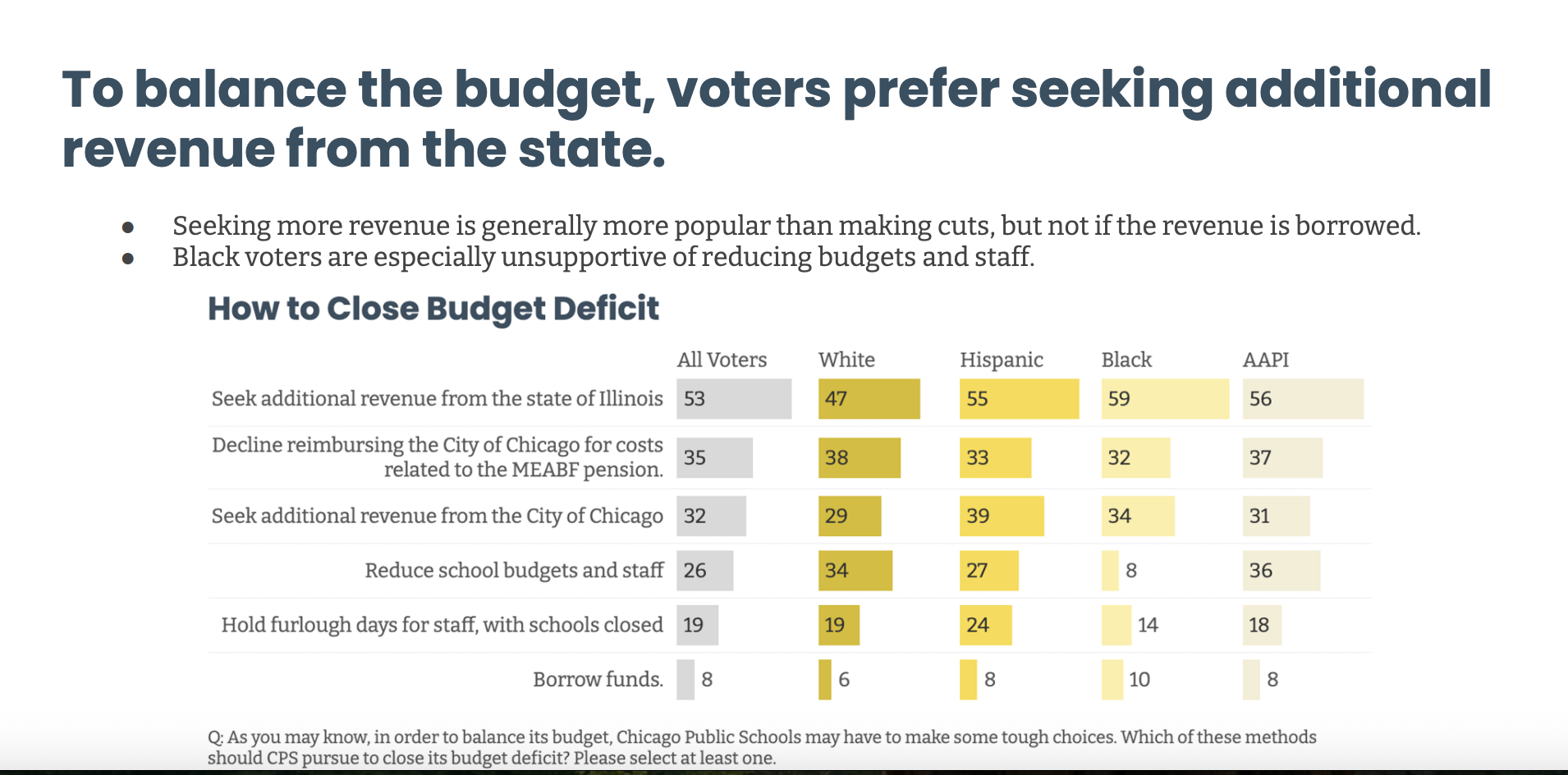 Black voters are the least likely to support cuts in school budgets and staff, and a slightly larger share of Black voters polled support borrowing over cuts to schools. Nonetheless, borrowing to solve CPS's financial crisis remains deeply unpopular.