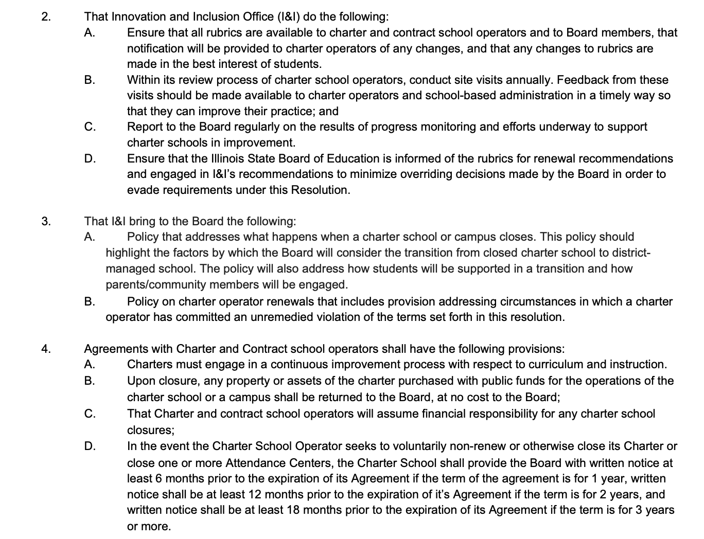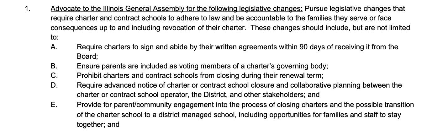 The resolution also promises that the board will advocate in Springfield for changes to the charter law: