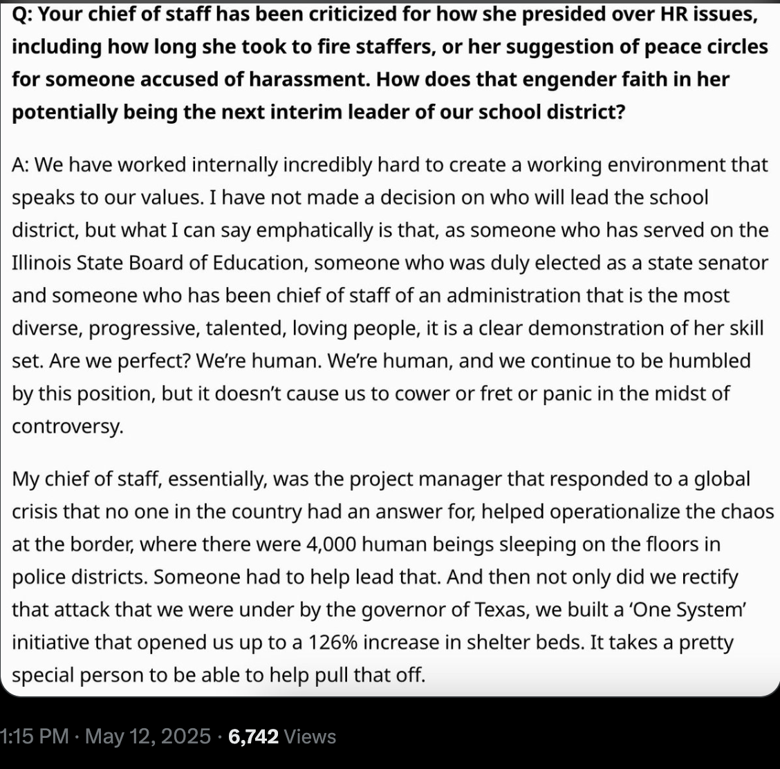 Rumors have been floating for months that Pacione-Zayas, a former state senator who now serves as Mayor Brandon Johnson's chief of staff, is Johnson's preferred pick to lead the school district. Pacione-Zayas flatly denied this when I asked her about it in October. Tribune reporters Alice Yin and Jake Sheridan wisely didn't bother asking Johnson if Pacione-Zayas was his pick; they just assumed it in an interview question about whether her people management skills were up to the task of leading the school district. The full interview is here, but it's paywalled. Here's the key question, as seen on X: