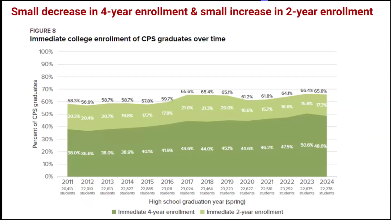 At the same time, the school district's investment in postsecondary advising may have limited the damage. "CPS has been investing really, really heavily in school counseling and other supports to help with this process," Nagaoka said. "It’s entirely possible in the absence of this effort, we could have seen a much larger decline in 4-year college enrollment."